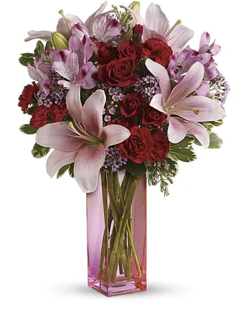 Red roses, white asiatic lilies, white daisy spray chrysanthemums, mini red carnations and sprigs of bupleurum and salal are presented in a graceful red glass vase. USA delivery.