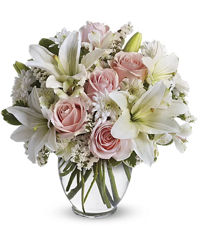 Featuring a beautiful selection of premium flowers in shades of pink and white, this bouquet is both elegant and timeless. Delicate roses, fragrant lilies, and stunning hydrangeas are expertly arranged in a clear glass vase, creating a truly breathtaking display.