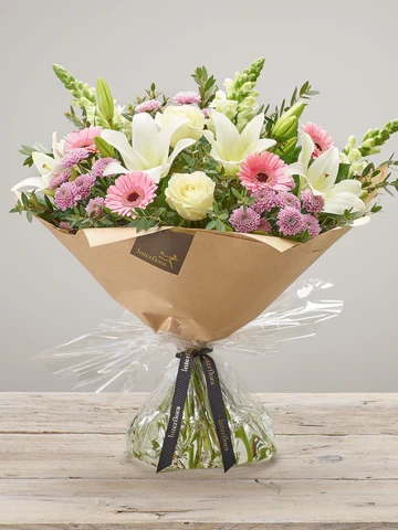 Beautiful large blooms of white roses accented with classy greenery and fillers, gift wrapped by professional local florist, is waiting to become graceful flower gift for a very special moment of yours. Same/next day delivery options. Send flowers in the United Kingdom from Dublin to Edinburgh, from Southampton to Glasgow. British floral experts at your service.